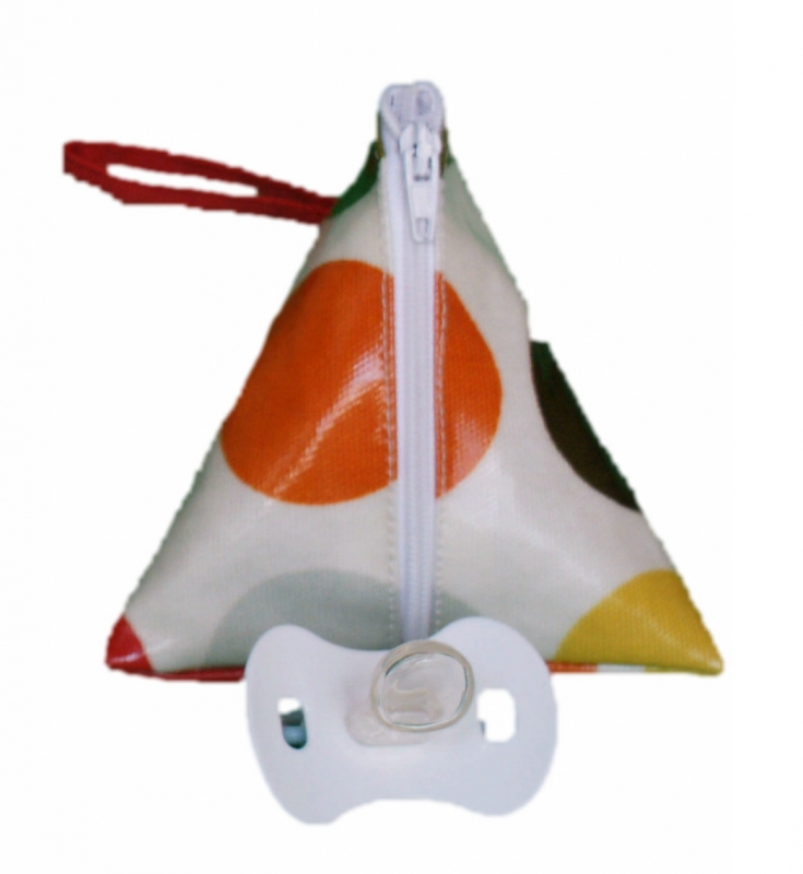 Grâce à cette jolie pochette forme berlingot, la sucette de bébé sera bien rangée. Elle est réalisée dans un coton enduit à l'extérieur à l'imprimé pois colorés aux couleurs vives ou imprimé pois blancs sur fond gris clair.